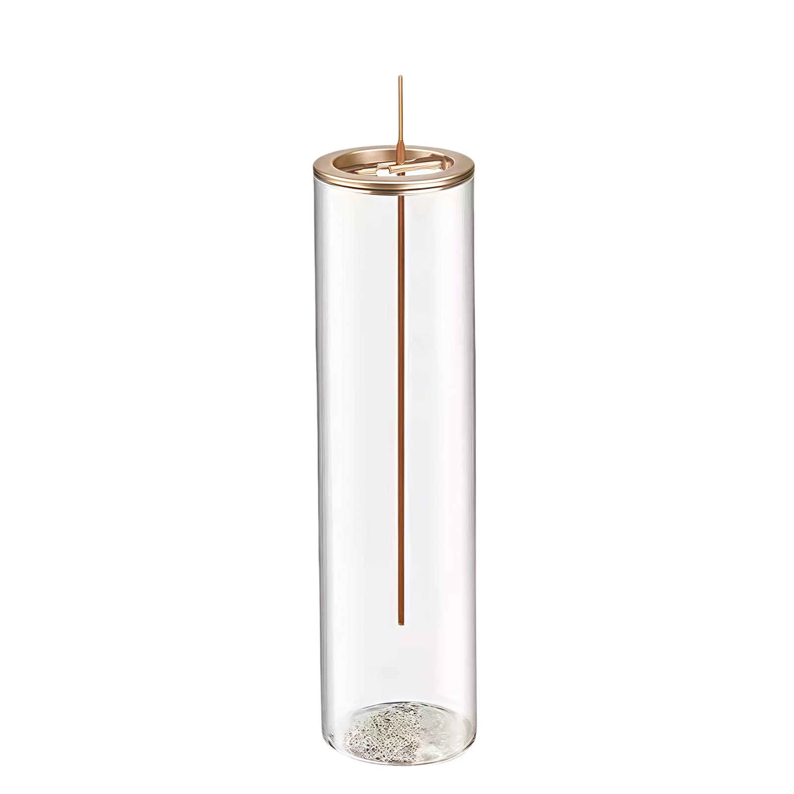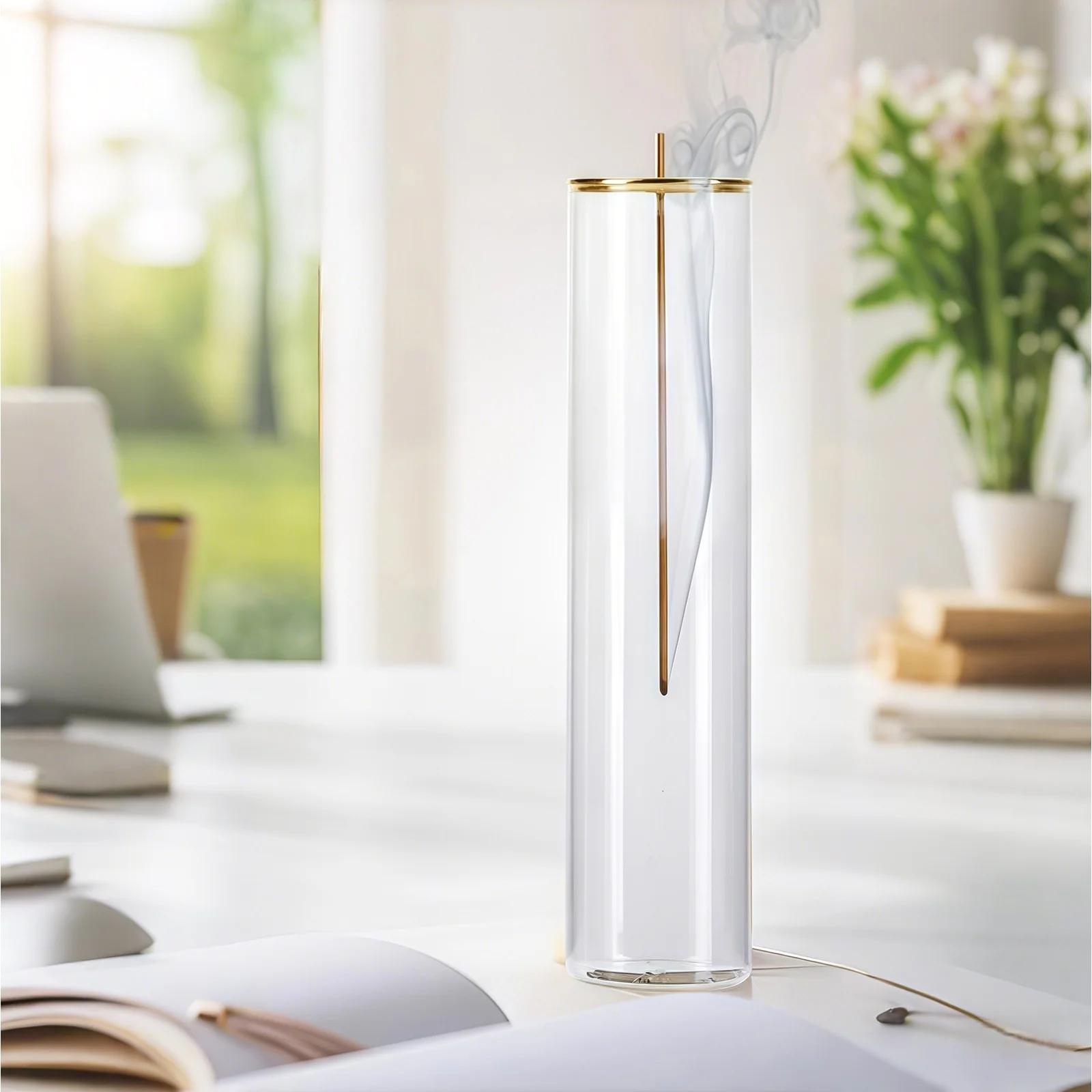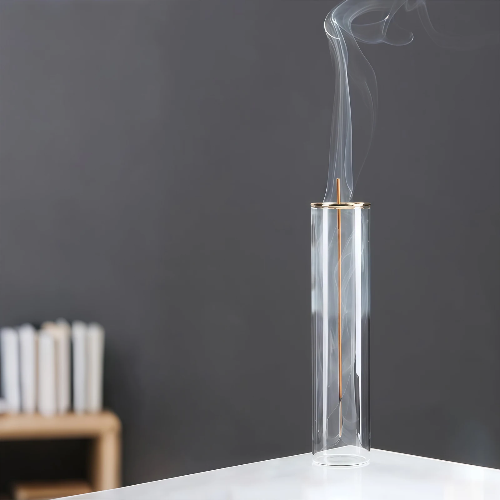 O corpo em vidro transparente permite acompanhar todo o processo da queima, enquanto o suporte interno em metalmantém o incenso firme e centralizado. As cinzas caem suavemente no fundo do recipiente, garantindo limpeza, segurança e praticidade, sem dispersão pelo ambiente.